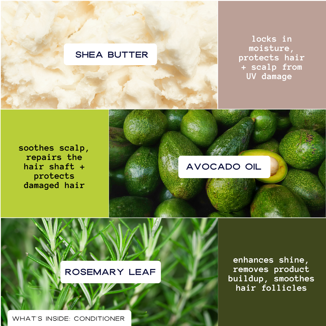 Water (Aqua), Behentrimonium Chloride, Cetyl Alcohol, Cetrimonium Chloride, Avocado Oil, Glyceryl Stearate, Shea Butter, Fragrance (Parfum), Rosemary Leaf Oil, Lavender Leaf Oil, Guar Hydroxypropyltrimonium Chloride, Panthenol, Caprylyl Glycol, Phenoxyethanol