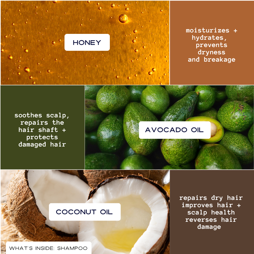 Water (Aqua), Disodium Laureth Sulfosuccinate, Lauryl Glucoside, Sodium Lauroyl Lactylate, Cocamidopropyl Betaine, Glycerin, Cocamide DIPA, Polyquaternium-7, Glycol Distearate, Sodium Lauroamphoacetate, Sodium Lauroyl Methyl Isethionate, Polyquaternium-10, Honey, Avocado Oil, Coconut Oil, Fragrance (Parfum), Rosemary Leaf Oil, Dehydroacetic Acid, Benzyl Alcohol, Guar Hydroxypropyltrimonium Chloride, Vitamin E, Vitamin C, Aloe Barbadensis Leaf Extract, Disodium EDTA, Citric Acid