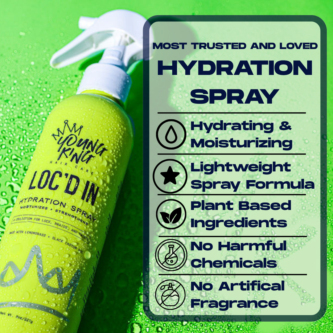 Enriched with the perfect blend of plant-based ingredients, including lemongrass, black castor oil and apple cider vinegar, our LOC'D IN Hydration Spray goes beyond the surface, working to deeply moisturize and strengthen each strand of hair. Pamper his crown with the nourishing benefits of nature, ensuring hair stays resilient and vibrant. Whether sporting intricate locs, rocking braids or twists, our Hydration Spray is your go-to companion for maintaining a stylish and healthy look!